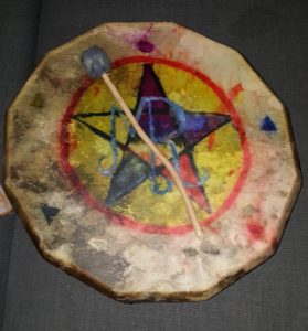Trumman är ett väldigt omtyckt redskap för att jobba med energier. Man använder trumman för healing, meditation, rensning och skapande av nya positiva energier. Man använder även trumman för trumresa. Att man trummar sig till trans för att resa mellan världarna, hämta kraftdjur mm. Har man ingen trumma kan man be någon annan trumma för en. Dess härliga vibration skapar ett inre lugn. På mässor brukar man öppna mässan med en trummning där man går runt i lokalen eller mässområdet och trummar för att ge alla mässdeltagare positiv energi under sitt arbete och vistelse på mässan. Min healing den shamanska regnbågsflamman är utmärkt att köra med trumma. Denna trumma som bilden visar är min personliga som en god vän gjort till mig motivet är mitt häxsigill som jag tagit fram . Och motivet ser nästan ut som om det brinner när färgerna flyter iväg och det passar bra eftersom min energi är en eld i regnbågens färger från moder jords innersta kärna och hjärta.